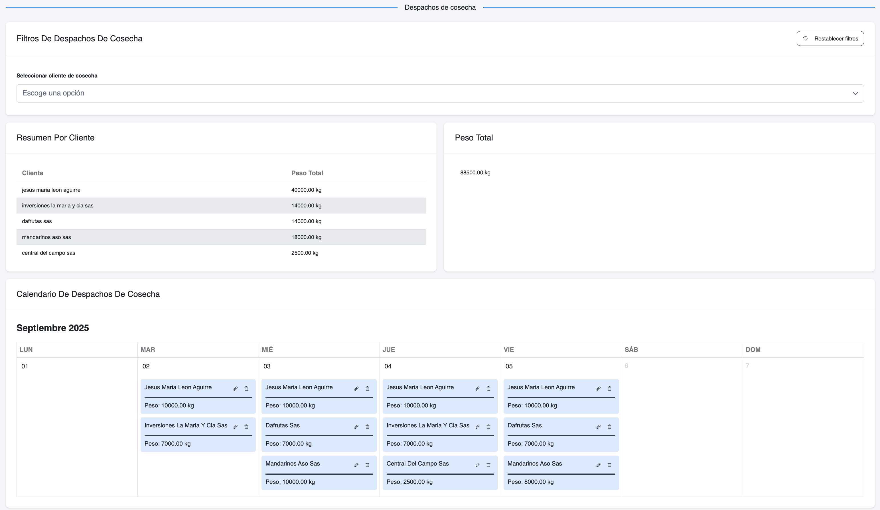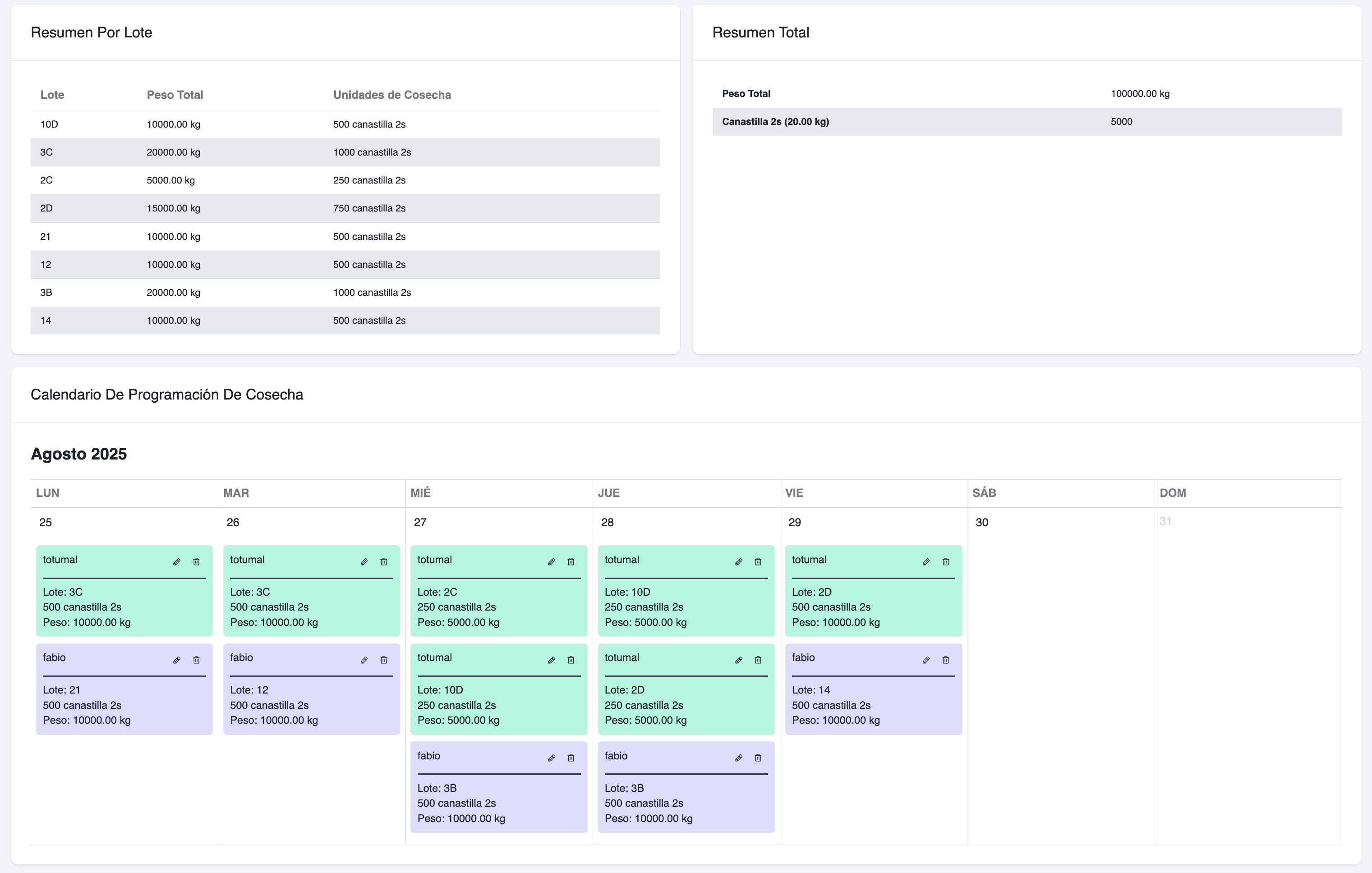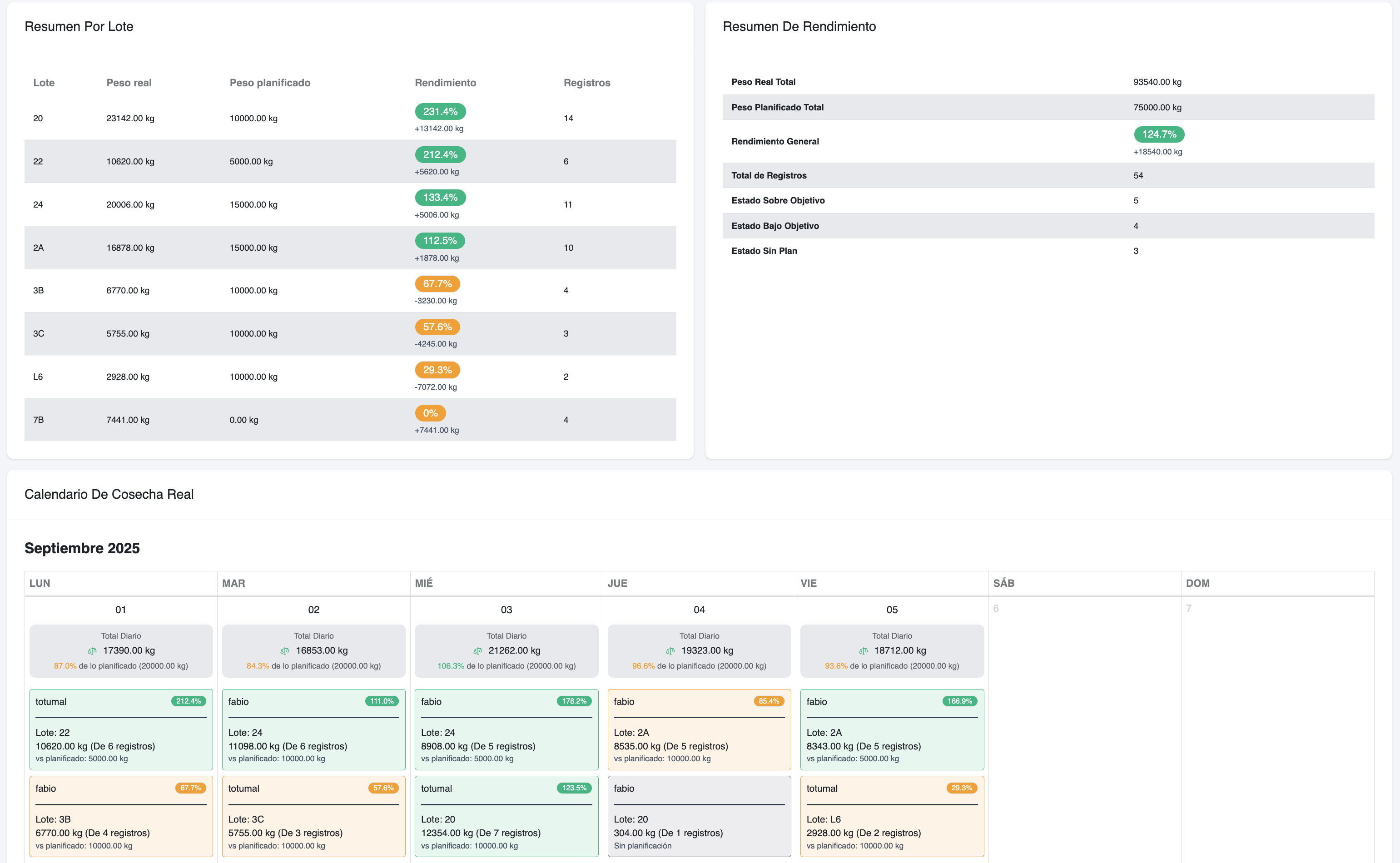 Usa la interfaz de calendario para planificar la cosecha diaria por lote, equipo y cantidades esperadas.